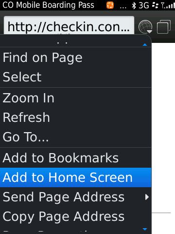I noticed something interesting this morning while playing with my new BlackBerry Torch 9800. I was checking in for a flight home and thought I'd try the new boarding pass on the mobile device thing. I finished my check-in and had the airline send the boarding pass to my work email account. I opened the message and clicked on the link to bring up the mobile boarding pass. It's a web page and the page had some instructions for how to make it easy to load the page while at the airport. I didn't want to bookmark this page, but I did want to try to save it locally on my device. As I opened the BlackBerry menu, I noticed a new option called 'Add to Home Screen' (shown in the following figure). Of course, that's what I wanted to do, so I selected that option.