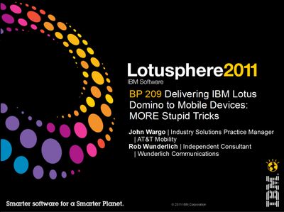 Attached is the presentation that Rob Wunderlich and I presented at Lotusphere 2011. The session was entitled BP209 Delivering IBM Lotus Domino Data to Mobile Devices: More Stupid Tricks and in it, Rob and I revisited our Ten Tricks for Mobilizing Domino from Lotusphere 2010. For this year's session, we took a look at last year's tricks and identified which ones didn't matter so much anymore (since the market changed the way it looked at the requirements) and tried to come up with some new ones.