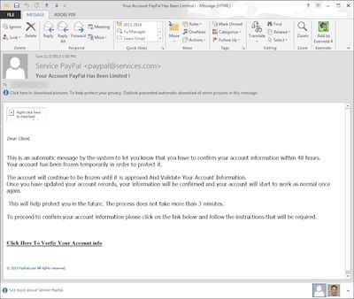 As you can see from the 'from' address, it's from paypal@services.com. Right away you can tell that the spammers were too stupid to even make it look like it came from paypal.com.