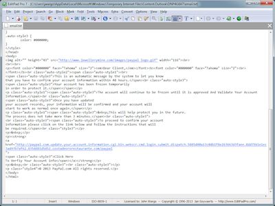 Got another spam email about my PayPal account. The text (and format of the email looked like it was exactly like the one I'd already written about), even the incorrect formatting of the link text at the bottom of the message. As I started looking at this one, I was able to tell immediately that it didn't come from PayPal. Take a look at this screen shot: