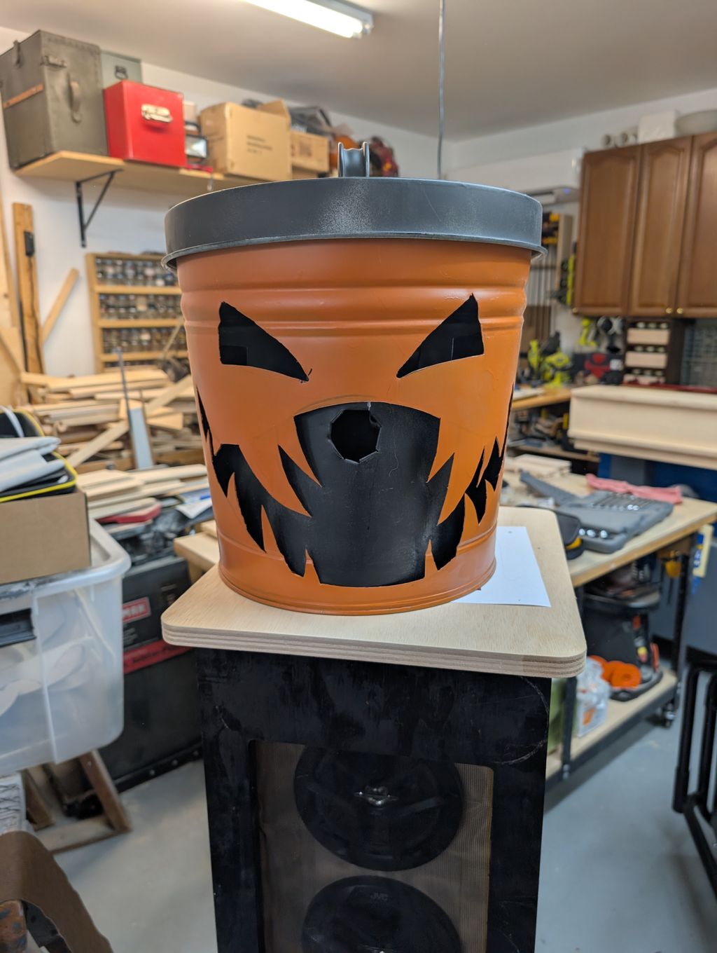 I built my pumpkin out of a steel coal bucket because I didn't want to have to carve a large pumpkin every year. I also mounted it on top of a large monster frame to put the flame way above any children's heads.