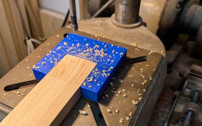 I knew I'd use my drill press instead of a handheld drill and the table for my drill press was cast iron, so I added holes to mount some rare earth magnets to the jig to hold it in place on the drill press. I ended up not having any magnets lying around to use for this purpose, so I ended up using two-sided woodworker's tape to hold the jig to the drill press while I drilled the holes.